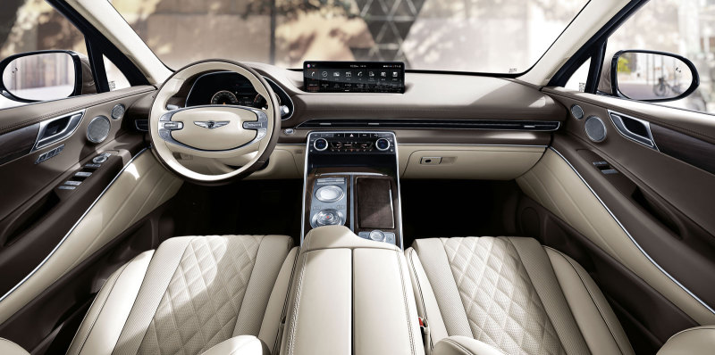 В салоне "Дженезис GV80" по всей передней консоли расположены узкие вентиляционные отверстия, что подчёркивает ширину салона. 14,5-дюймовый экран мультимедийной системы расположен в верхней части центральной консоли. Количество физических переключателей было сведено к минимуму. Все поверхности в салоне – от дверных карт до боковых панелей центральной консоли – отделаны мягкими материалами.