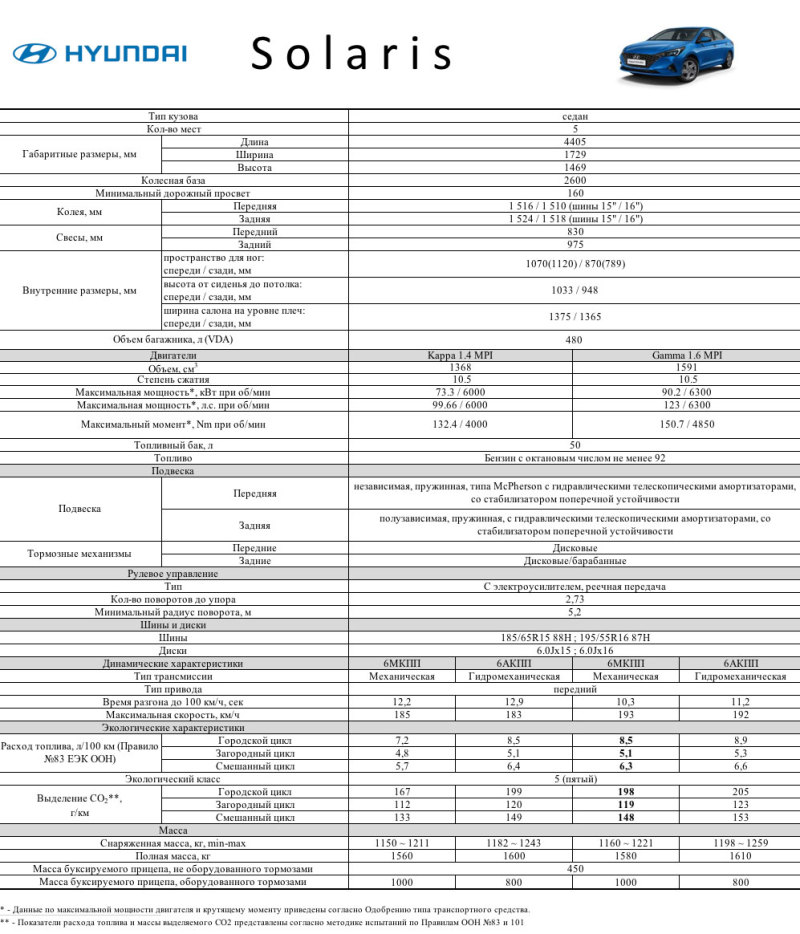 Hyundai Solaris 2020 оснащается прежними бензиновыми моторами Kappa и Gamma объёмом 1,4 л и 1,6 литра (100 и 123 л.с.), которые комплектуются 6-ступенчатой механической или автоматической трансмиссией. Теперь Solaris оснащён удалённым запуском двигателя.