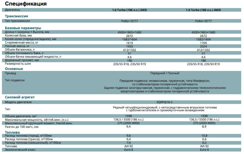 Длина автомобиля составляет 4,5 метра. Дорожный просвет у переднеприводного кроссовера равен 196 мм, у полноприводного он на 10 мм меньше.