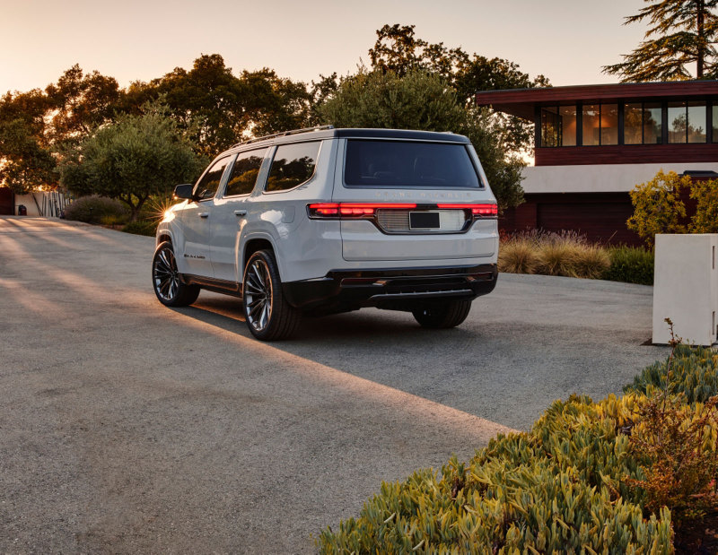 Внешне Jeep Grand Wagoneer имеет угловатый габаритный кузов, при этом сверху основной части решётки радиатора и головной оптики у него проходит светодиодная полоса по всей ширине машины.