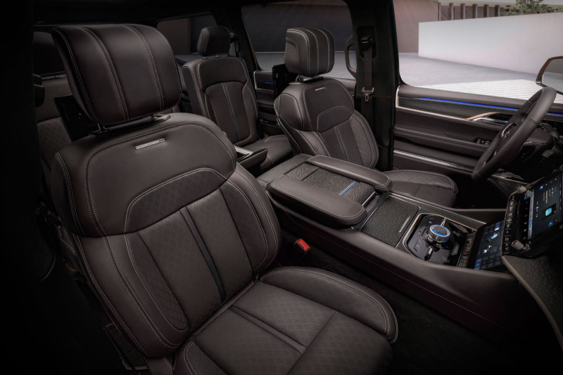 Салон Jeep Grand Wagoneer получит семь мест, с учётом водителя. Он начинён множеством дисплеев и шайбой управления режимами трансмиссии.