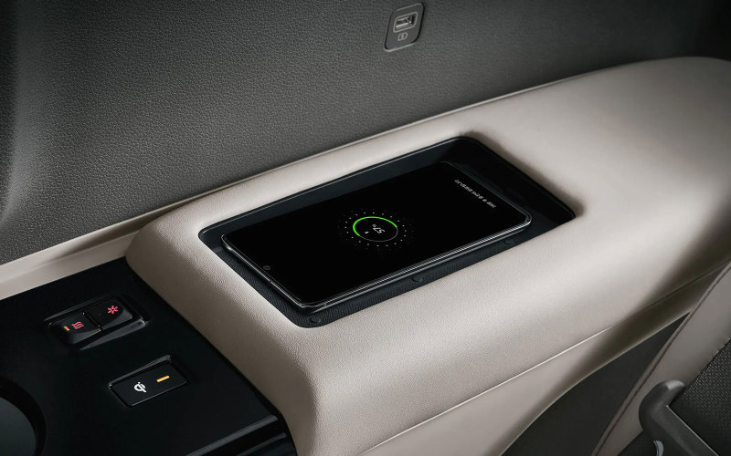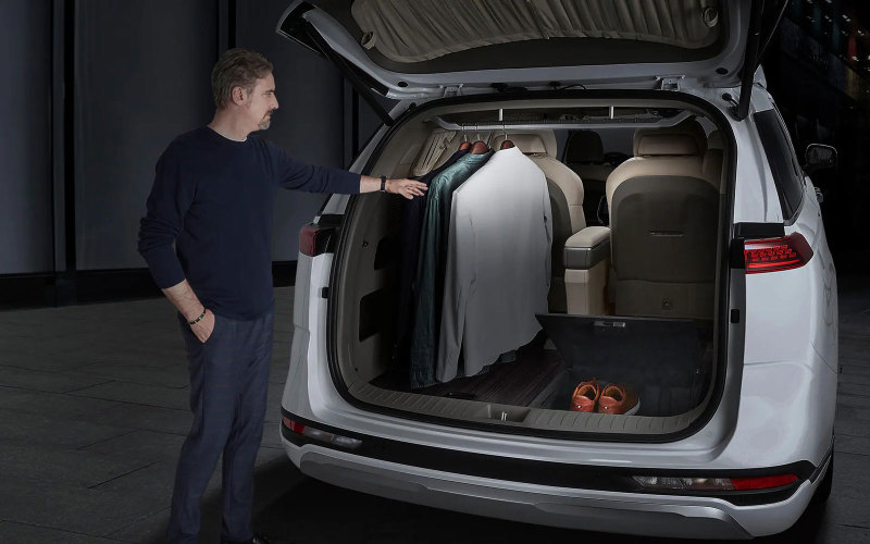 Для пассажиров второго ряда предусмотрен отдельный дисплей мультимедийной системы с диагональю 21,5”. В их распоряжении также боковые столики, дополнительные закрывающиеся отсеки и ящички для хранения небольших предметов, подстаканники с функциями подогрева и охлаждения, панели беспроводной зарядки мобильных устройств. В багажнике Kia Carnival HiLimousine установлена вешалка со светодиодной подсветкой и ящик для обуви.
