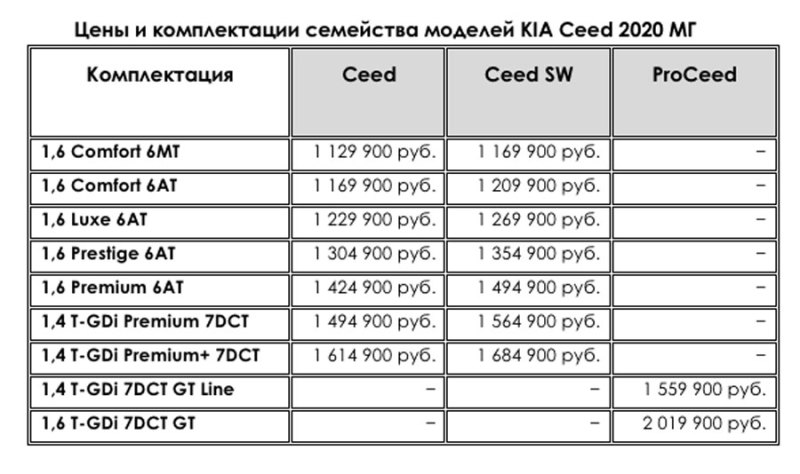 Реализация автомобилей в минимальной комплектации Classic с двигателем 1,4 MPi в сочетании с механической трансмиссией, а также комплектаций Luxe и Prestige с двигателем 1,4 T-GDI и роботизированной трансмиссии прекращена. Базовой версией для моделей Ceed и Ceed SW теперь выступает комплектация Comfort 1,6 MPI c механической коробкой передач.