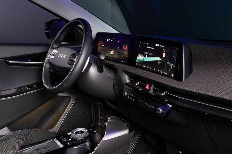 Конструктивные особенности электромобиля позволили сделать пол Kia EV6 абсолютно плоским и увеличить колёсную базу до 2900 мм. В результате простор в салоне сопоставим с интерьерами многих среднеразмерных кроссоверов.