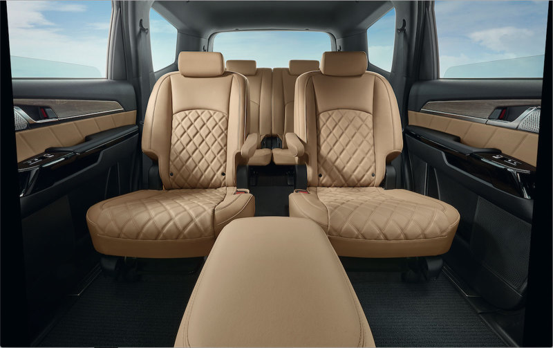 В комплектации Premium+ внедорожник Kia Mohave имеет два раздельных кресла "капитанского" типа с регулируемыми по высоте и углу наклона подлокотниками на втором ряду. Кресла оснащаются трёхуровневым обогревом и вентиляцией. В дополнение к шторкам безопасности по всей длине салона предусмотрены задние боковые подушки безопасности. Также в задней части центральной консоли размещены подстаканники для пассажиров второго ряда.