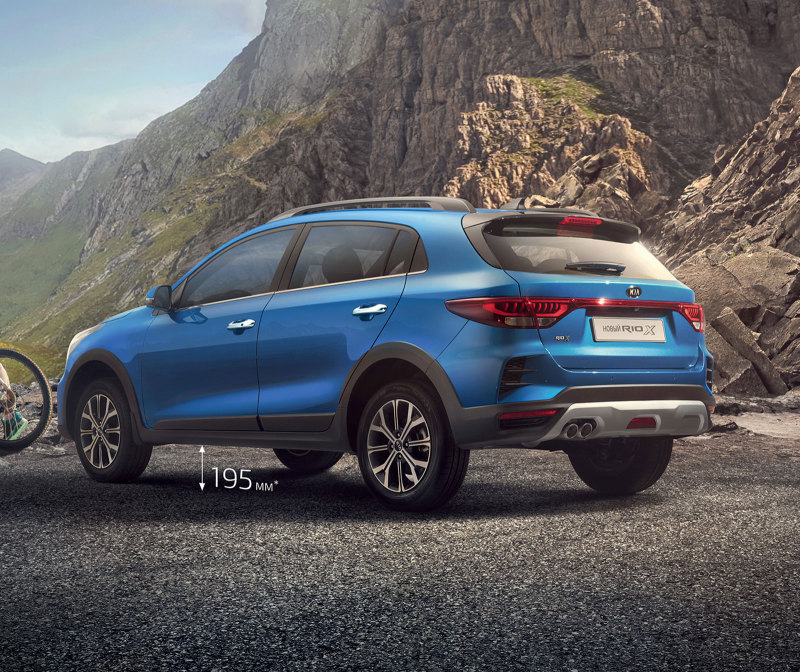 KIA Rio X получил новый дизайн решётки радиатора, агрессивный передний бампер, в облике заднего бампера визуальной доминантой стала серебристая накладка, вместе со сдвоенным наконечником выпускной трубы. Контрастными акцентами в дизайне стали рейлинги на крыше, спойлер на двери багажного отсека, накладки дверей и колёсных арок – все окрашенные в чёрный цвет.