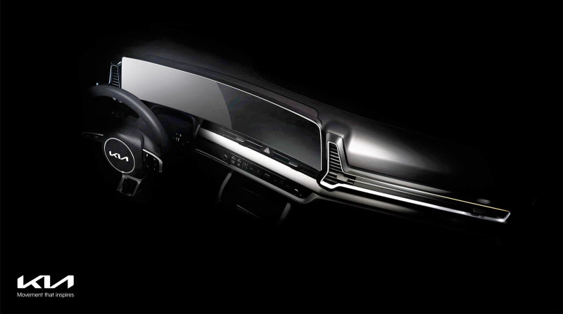 На одном тизере показана передняя панель "Спортажа", здесь цифровая комбинация приборов и сенсорный дисплей мультимедийной системы объединены в один экран, появилось рулевое колесо новой формы. Функциональные клавиши разместили на компактном блоке управления ниже основного экрана.