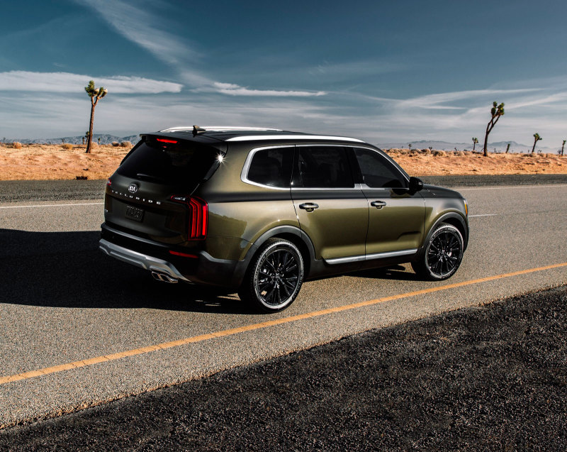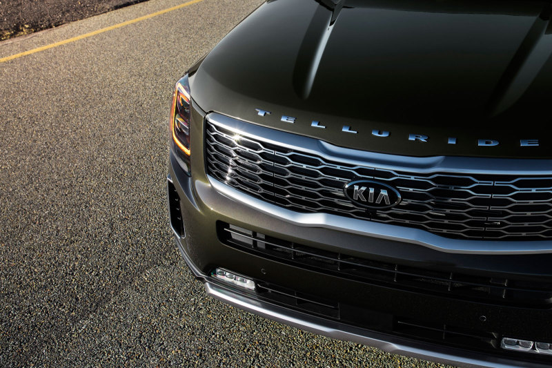Дизайн KIA Telluride по мнению разработчиков должен вызывать ассоциации с легендарными классическими внедорожниками прошлых лет, поэтому кузов имеет намеренно угловатые формы. Обращают на себя внимание длинный и широкий капот, массивная радиаторная решётка, выразительные блок-фары с чётко различимыми секциями. Лобовое стекло установлено более вертикально, чем это обычно делается в наши дни. Светодиодные задние фонари выполнены в форме перевёрнутой буквы L. В рельефный изгиб пластины задней нижней защиты интегрированы сдвоенные патрубки выхлопных труб.