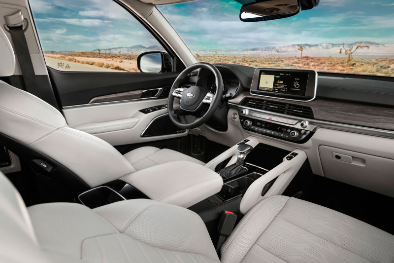 В салоне KIA Telluride расположена широкая передняя консоль, которая имеет акцентированное горизонтальное зонирование. Внедорожный характер модели подчёркивает ручка для переднего пассажира на центальной консоли. Отделка салона выполнена из высококачественных материалов, при этом возможно выбрать опциональный вариант отделки сидений из сверхмягкой кожи сорта Nappa, с двойной прострочкой, отделку со вставками под "матовый металл" и матовое дерево. Регулирующийся в двух плоскостях руль отделан кожей и может быть оснащён подогревом. Предусмотрена возможность не только обогрева, но и вентиляции сидений двух передних рядов. Система климат-контроля для сидений второго ряда имеет собственный потолочный блок управления, а диффузионные потолочные воздуховоды обеспечивают более рассеянные воздушные потоки.