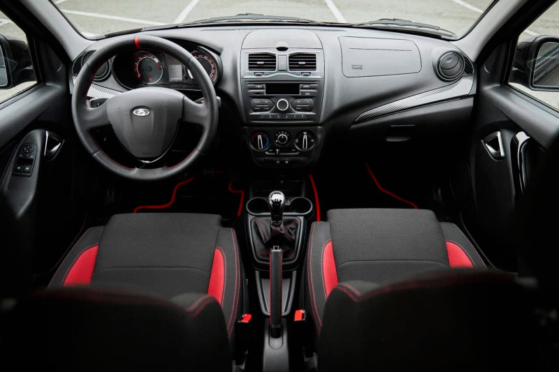 Интерьер Lada Granta Sport отличается специальной контрастной отделкой. Сиденья выполнены с выраженной боковой поддержкой. Также появились кожаная оплётка руля, ручки КПП и ручного тормоза, красная нулевая отметка на рулевом колесе. Красный цвет применяется и в оформлении комбинации приборов, и на молдингах бамперов.