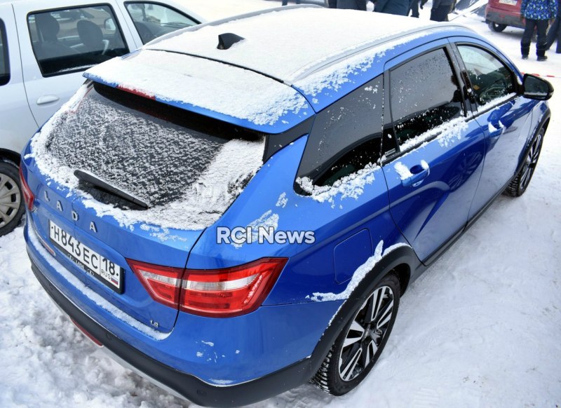 Конкретный автомобиль окрашен в ярко-синий цвет, боковые зеркала и крыша выполнены "под глянец". Среди других заметных отличий данного экземпляра Lada Vesta SW Cross Exclusive можно отметить радиоантенну на крыше в форме "плавника", спойлер, задние дисковые тормоза, плоский запирающийся лючок бензобака и рейлинги.