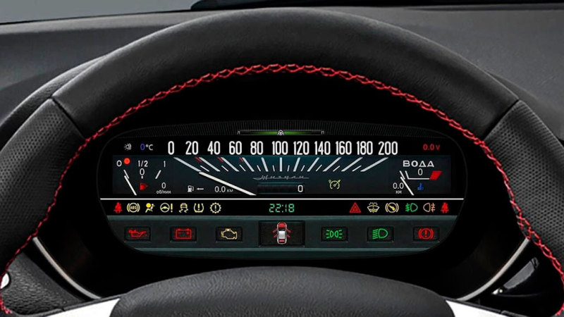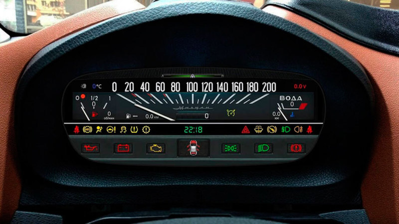 В одном из вариантов отображения показаний, аналогично "копейке" выглядит спидометр по центру, слева индикатор уровня топлива, справа находятся показатели с датчика температуры двигателя.