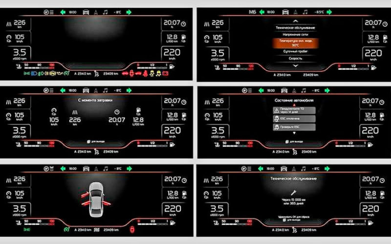 На экране могут показывать незакрытые двери машины, среднюю скорость автомобиля, запас хода, часы, средний расход топлива, предупреждения о неисправностях, датчик температуры топлива.