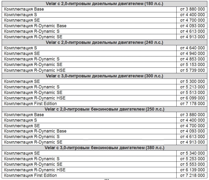 Рекомендованные розничные цены на новый Land Rover Range Rover Velar представлены в таблице ниже.