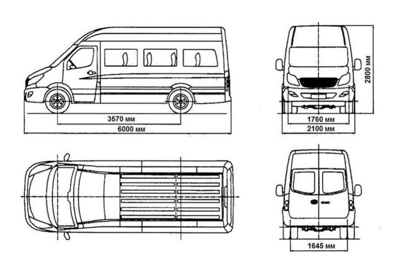 Габаритные размеры МАЗ 281040: длина - 6.000 мм, ширина – 2.100 мм, высота - 2.800 мм, колёсная база - 3.570 мм, полная масса – 4.050 кг. Размерность шин - 185/75 R16С LT.