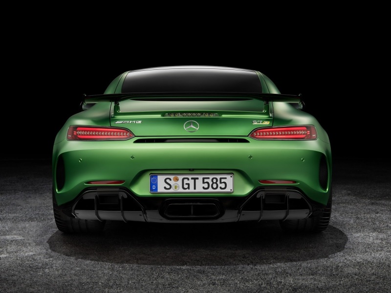 Mercedes-AMG GT R оснащен заднеприводной трансмиссией, 4-литровым турбированным мотором V8 мощностью 577 л.с. и 7-ступенчатой КПП с двумя сцеплениями.