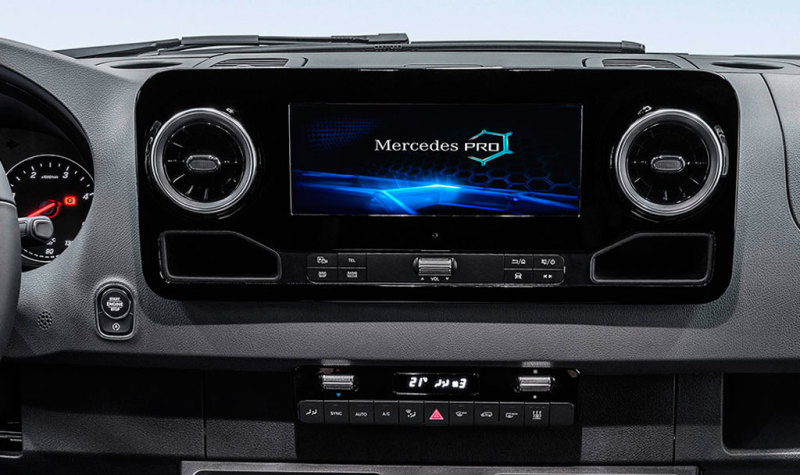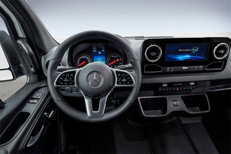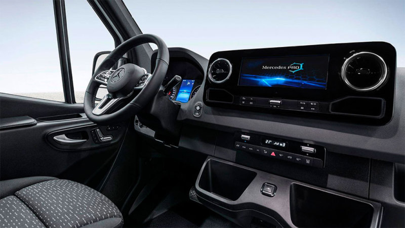 В салоне нового "Спринтера" на передней панели установлен большой сенсорный дисплей информационно-развлекательной системы, также на предварительных изображениях и видео можно увидеть трёхспицевый руль. В оснащении салона будут доступны USB-порты, автоматический климат-контроль и розетка на 220 вольт. На пассажирских версиях планируются широкие кресла с откидывающейся спинкой, регулируемыми подголовниками, трёхточечными ремнями безопасности и подстаканнниками.