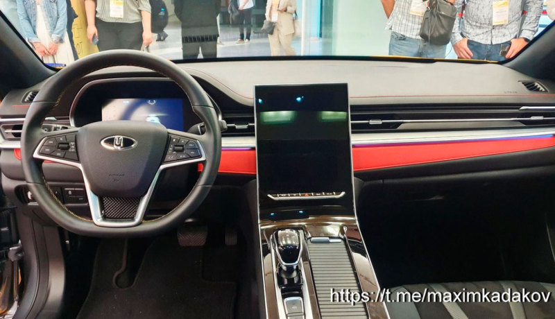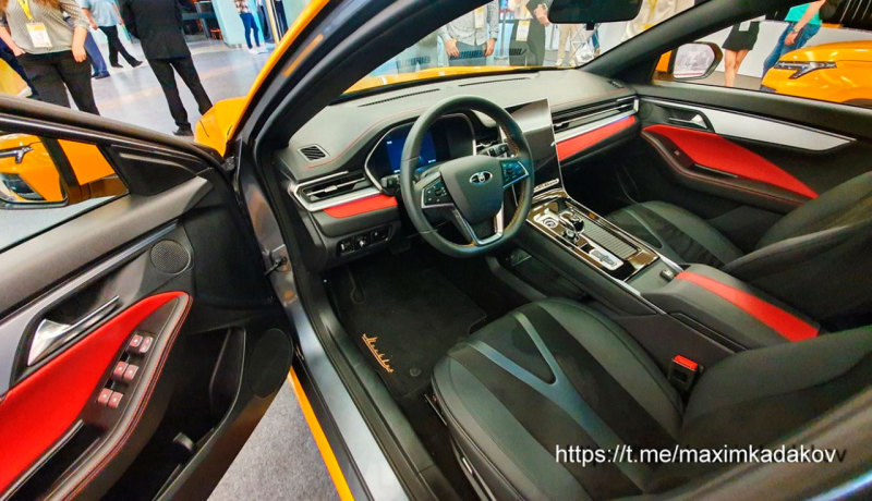 Интерьер модели "Москвич 6" имеет большой вертикальный экран медиасистемы, виртуальную комбинацию приборов, красные акценты отделки в спортивном стиле.