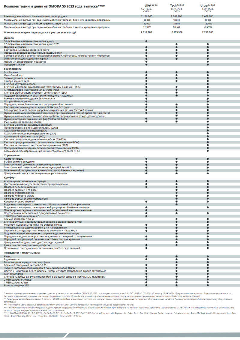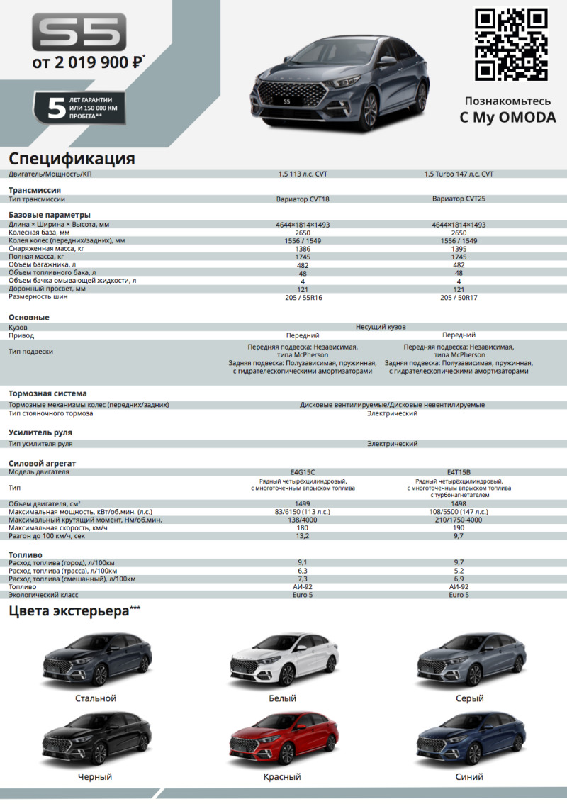 Седан Omoda S5 в комплектации Tech оснащен более мощным 1,5-литровым турбированным бензиновым двигателем мощностью 147 л.с. и отличается наличием 17-дюймовых легкосплавных колёсных дисков, датчиком дождя, климат-контролем с функцией ионизации воздуха, обогревом сидений первого и второго ряда, рулевого колеса, лобового стекла и форсунок стеклоомывателя. Цены на автомобиль стартуют с 2.270.000 рублей.