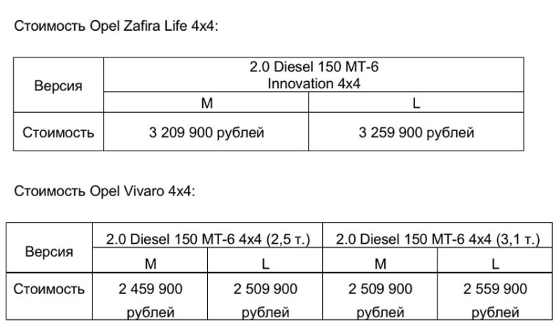 Модификации автомобилей с полным приводом будут доступны в двух вариантах длины кузова: для Opel Zafira Life 4х4 - M (4956 мм) и L (5306 мм) в комплектации Innovation; для Opel Vivaro 4х4 - M (4949 мм) с объёмом грузового отсека 5.3 м? и L (5309 мм) с объёмом 6.1 м?