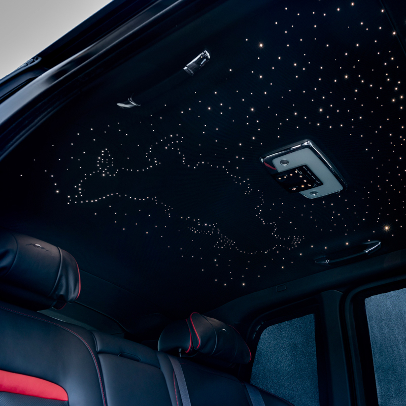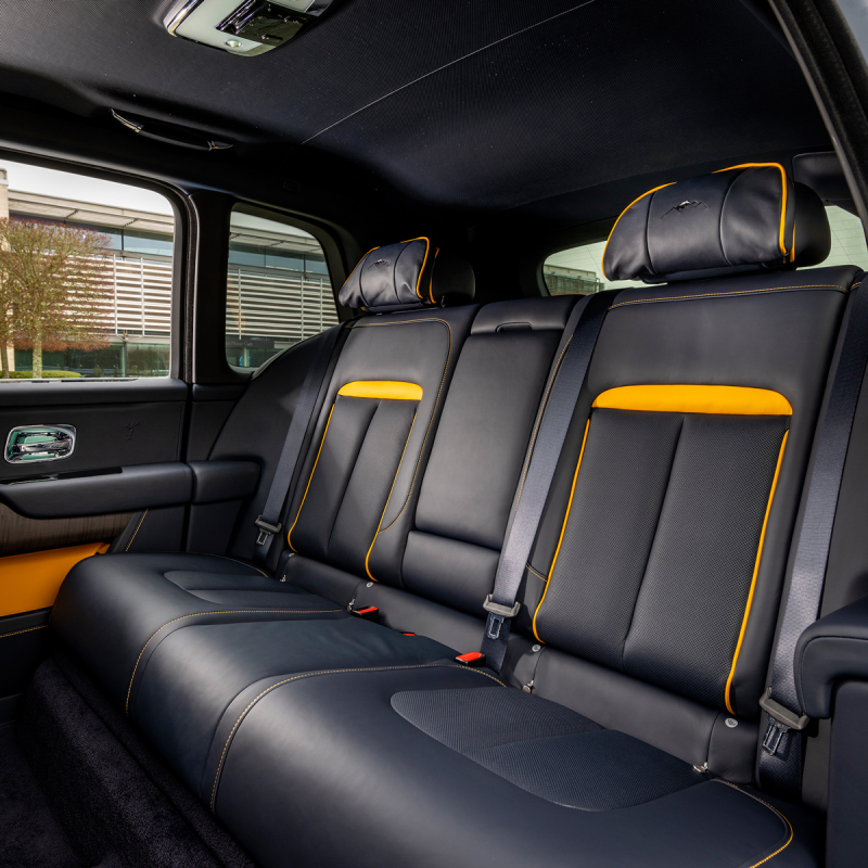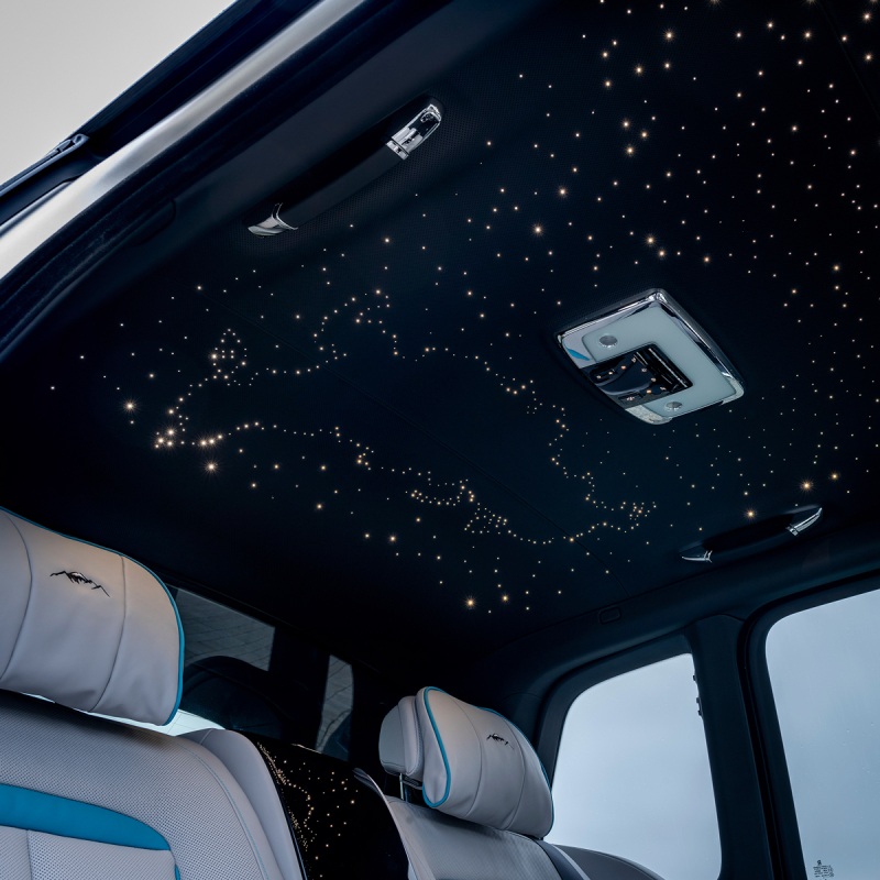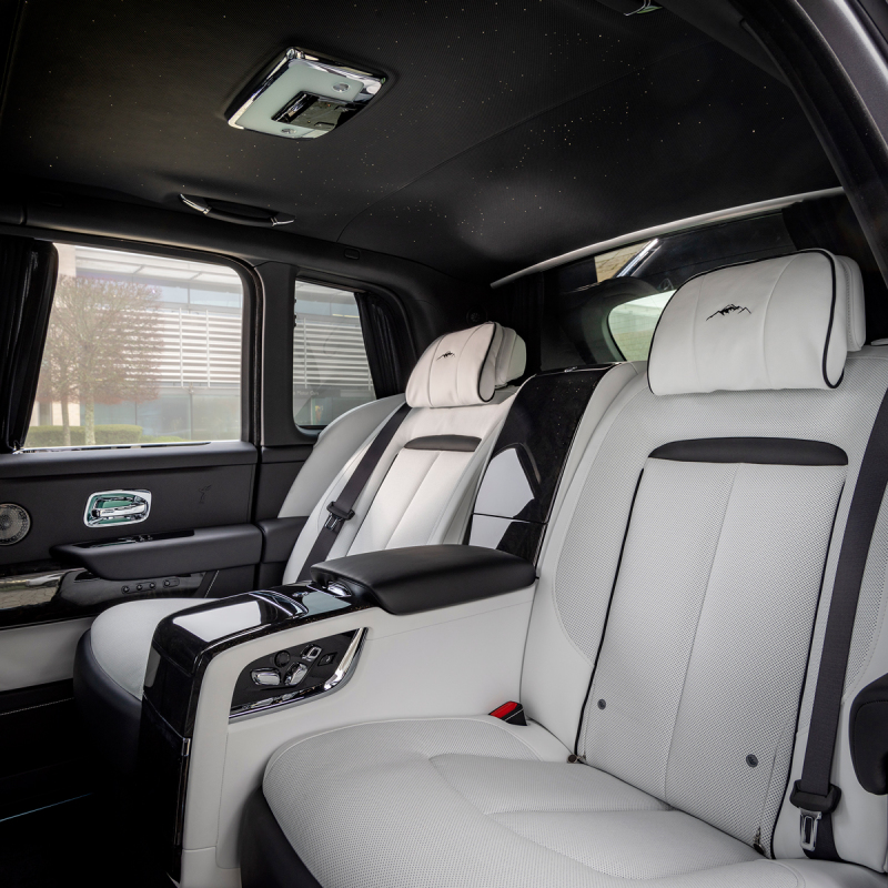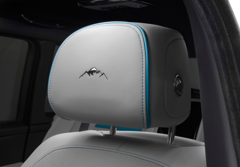 Для отделки салона каждого Cullinan выбран индивидуальный контрастный оттенок, отражающий уникальность возвышенностей. Заснеженные пики гор – символ коллекции – вышиты на подголовниках автомобиля. Жемчужина коллекции – "звёздное небо", дизайн которого впервые в истории выполнен в форме географической карты России.