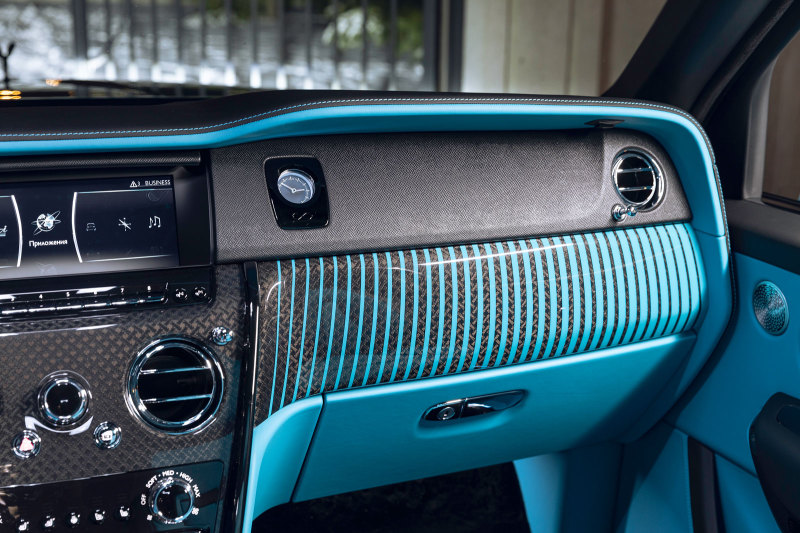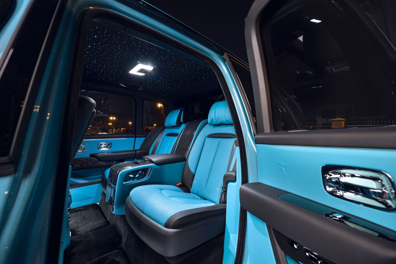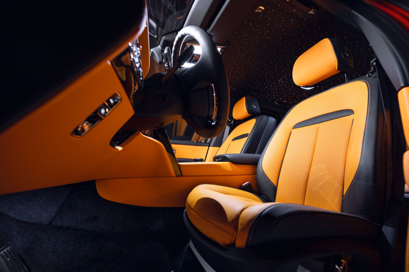 В салоне Rolls-Royce Cullinan Black & Bright применяется яркая вариация звёздного неба. В каждом автомобиле звёзды загораются разноцветными огнями – красным, оранжевым, жёлтым, фиолетовым и голубым, – перекликаясь с оттенком кузова и контрастными деталями в салоне.