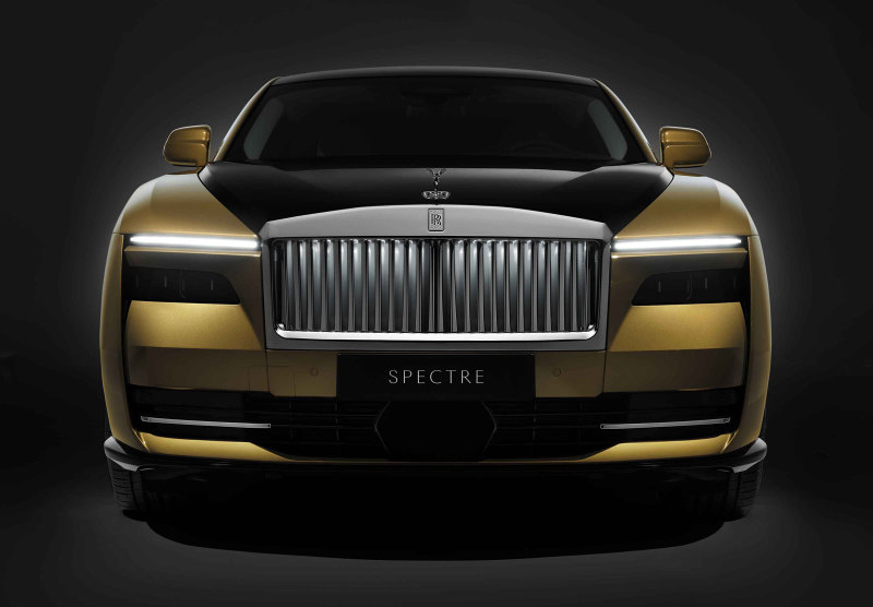 В передней части кузова привычная форма решётки радиатора сочетается с узкими полосками ходовых огней и затемнёнными головными фарами, расположенными ниже. Такие решения видимо будут применяться в новом фирменном стиле марки. Двери Rolls-Royce Spectre, по традиции, открываются против хода.