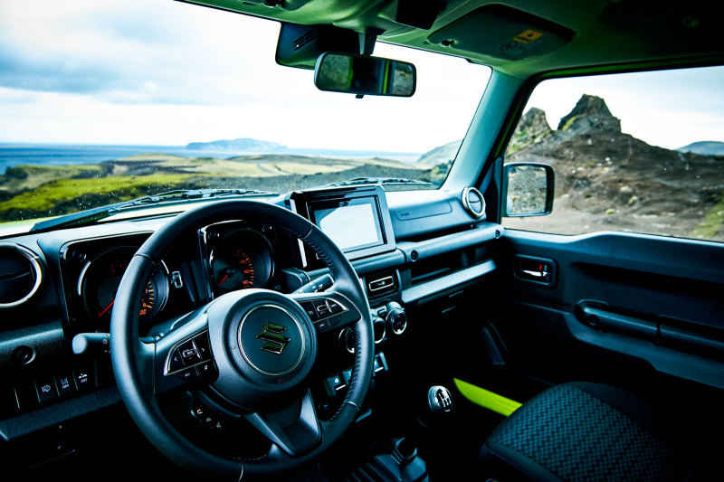 Топовая версия GLX нового Jimny включает в себя также передние светодиодные LED фары прожекторного типа с автоматическим корректором и омывателями, чёрные окрашенные боковые зеркала с обогревом, климат-контроль, мультимедийную систему с возможностью подключения смартфона, навигационную систему и bluetooth, круиз-контролем, ручку рычага коробки передач с отделкой под рояльный лак, розетку 12В на центральной консоли и в багажном отделении, органайзер багажного отделения.
