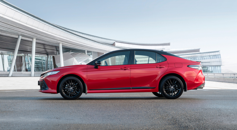 Специальная версия Toyota Camry GR Sport отличается эксклюзивным экстерьером и двумя вариантами двухцветной отделки: белым или красным кузовом с чёрной крышей или полностью в цвете "чёрный металлик". Автомобиль отличается уникальным дизайном 18-дюймовых колёсных дисков, логотипом GR Sport на крышке багажника, ручками дверей, окрашенными в цвет кузова, а также чёрными акцентами: корпусами боковых зеркал, планками и боковыми окантовками решётки радиатора, задним спойлером и эмблемой на черном фоне.