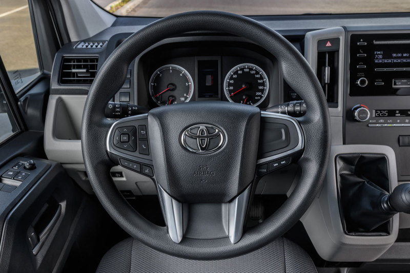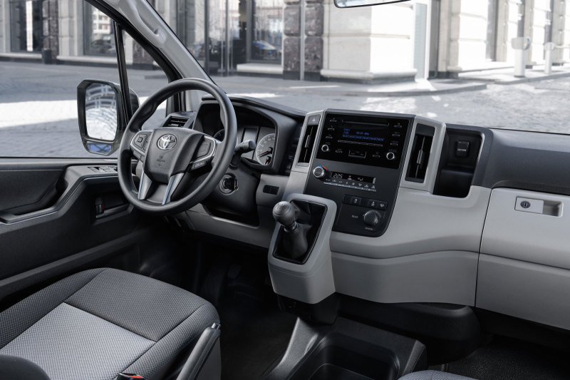 В новом поколении Toyota Hiace особое внимание было уделено улучшению рабочего места водителя с точки зрения эргономики и комфорта. Водительское кресло получило более удобную посадку, заметно улучшился обзор, а благодаря тому, что двигатель смещён в переднюю часть автомобиля, повысился и акустический комфорт – мотор должно быть практически не слышно в салоне.