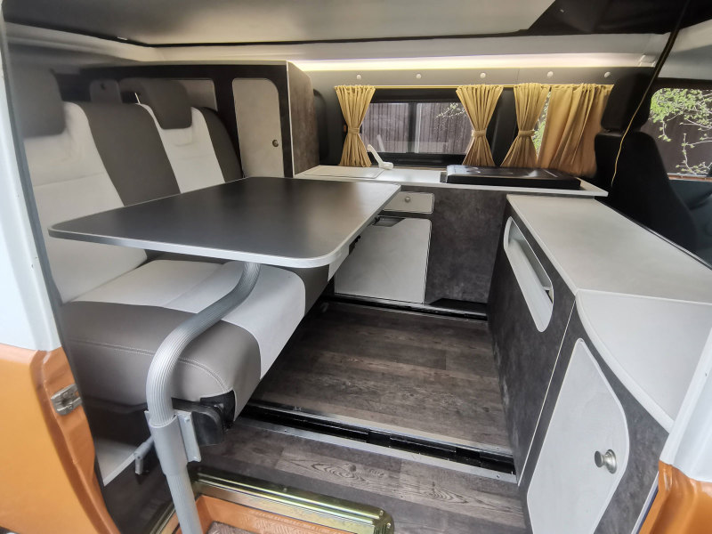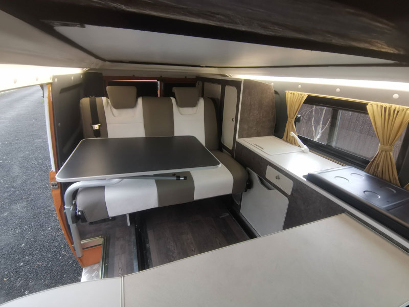 Диван оснащен трёхточечными ремнями безопасности для двух пассажиров и крепежом для установки столешницы. Последнюю можно использовать в качестве обеденного или рабочего стола.