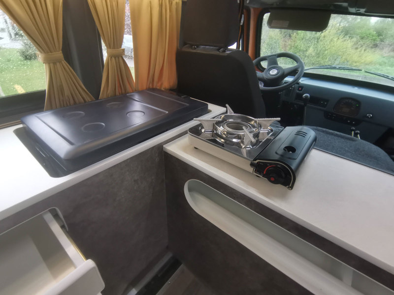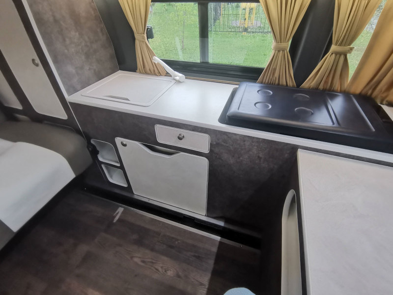 Кухонный модуль по левой стороне салона оборудован встроенным автомобильным холодильником с верхней загрузкой, портативной плитой, мойкой с крышкой в виде разделочной доски, смесителем для подачи воды и выдвижным ящиком для хранения столовых приборов. Здесь же предусмотрены ниша для транспортировки портативного туалета, шкаф для личных вещей и багажа, а также технический отсек, вмещающий два 20-литровых водяных бака.
