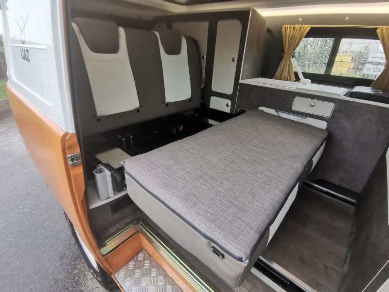 Одним из главных атрибутов и одновременно основой нового комплекта салонной мебели служит диван-трансформер. Специальный механизм раскладывания и дополнительный мягкий модуль позволяют оперативно оборудовать полноценное спальное место (1950 х 1200 мм). При необходимости заднее сиденье сдвигается по всей длине салона с помощью направляющих или демонтируется, высвобождая просторный грузовой отсек.