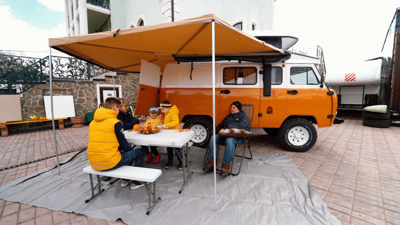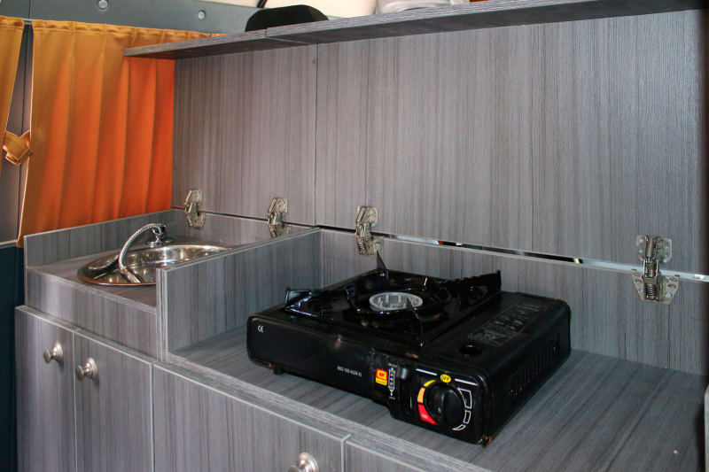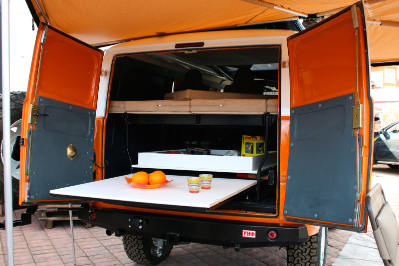 В УАЗ "Байкал" имеется полностью оборудованная кухня со встроенной раковиной и смесителем, мобильным холодильником, 20-литровыми баками для воды, столешницей для портативной плиты, шкафчиками и выдвижными столиками.