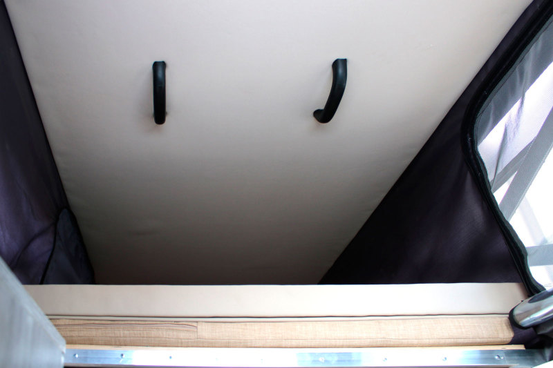 Высота салона с поднятым верхом достигает двух метров, что позволяет комфортно передвигаться и беспрепятственно раскладывать расположенную на верхнем уровне двуспальную кровать размерностью 1950х1255 мм. В верхней части крыши установлены пластиковые окна и москитные сетки.