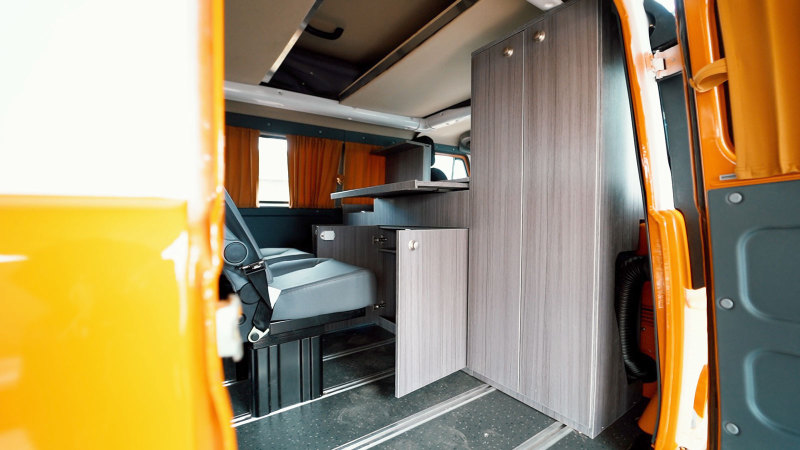 Функционал кемпера расширяет комплект модульной мебели, изготовленной из облегчённой ламинированной пластиком фанеры. Монтаж производится на быстросъёмные соединения по заранее установленными направляющим в полу салона с возможностью рокировки модулей в зависимости от предпочтений.