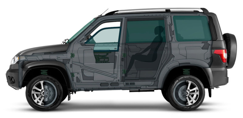 При сборке бронированных внедорожников демонтируют стандартный бензиновый 4-цилиндровый 150-сильный мотор (2,7 литра) "ЗМЗ-Про" и 5-ступенчатую китайскую МКПП BAIC.