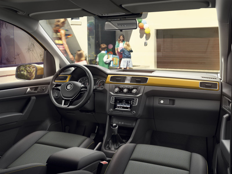 Дополнительные визуальные акценты в новом Caddy Family — 16-дюймовые стальные диски с декоративными колпаками. Опционально для автомобиля в фирменном цвете Sandstorm Yellow доступны 17-дюймовыми легкосплавные диски Madrid с прозрачным жёлтым покрытием и цветные вставки на панели приборов в цвет кузова.