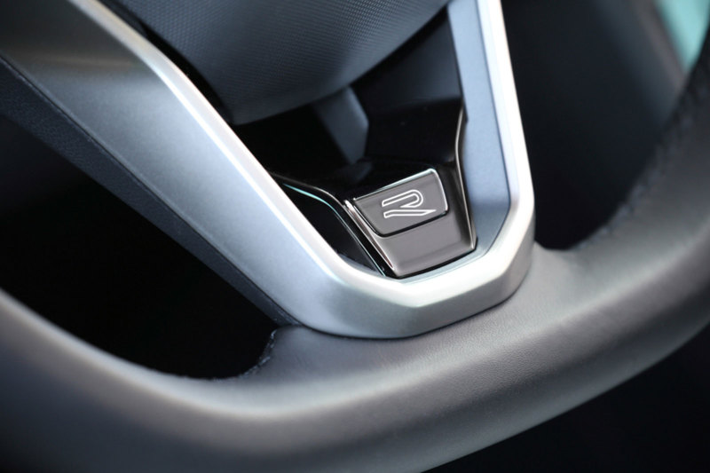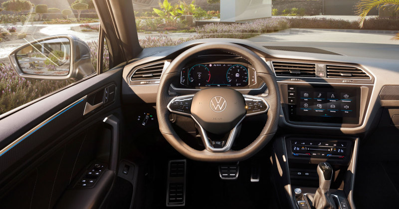 Интерьер топовой версии дополнен многофункциональным рулевым колесом R-Line с кожаной отделкой, подогревом, сенсорными кнопками и подрулевыми лепестками, передними сиденьями с электрорегулировками и функцией памяти и поясничным подпором.