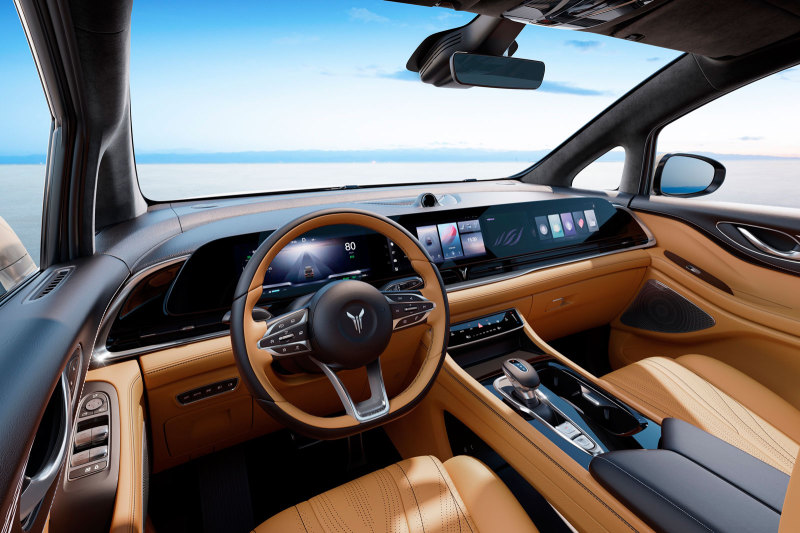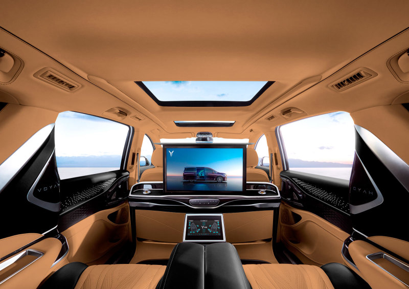 Voyah Dram First оснащён тремя инновационными мультимедийными экранами суммарной шириной 1 400 мм (диагональю 12,3 дюйма каждый), с эксклюзивными функциями на каждом дисплее, а также дополнительным выдвижным дисплеем диагональю 34 дюйма для пассажиров второго ряда и дисплеем в заднем подлокотнике для управления функциями комфорта.