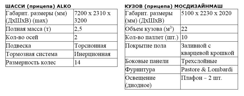 Кузов прицепа «Мосдизайнмаш» изготовлен из высококачественных сэндвич-панелей, наружные и внутренние соединения которых герметичны, выполнены с применением алюминиевого профиля и высокопрочных клеев. Панель пола призвана выдерживать сильные динамические нагрузки и представляет собой полиуретановое теплое и износостойкое покрытие с кварцевой крошкой, препятствующей скольжению груза во время движения.