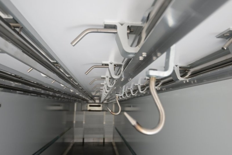 Так, совсем недавно было выпущен новый полуприцеп-тушевоз уникальный по своим качествам. Конструкция фургона-тушевоза «Мосдизайнмаш» основывается на многочисленных испытаниях, проводимых совместно с поставщиками материалов, а также точных расчетах статических и динамических нагрузок, создаваемых подвешенными на крюках охлажденными мясными тушами. Наибольшее внимание инженеры уделили тому, чтобы перевозка туш проходила со строгим соблюдением гигиенических требований к транспортировке и хранению пищевых продуктов. Именно поэтому крюки и направляющие созданы из материалов, не подверженных коррозии, а многослойные сэндвич-панели, традиционно обладая высокой механической прочностью и отличной теплоизоляцией, полностью соответствуют санитарным и экологическим нормам. При их изготовлении использован новейший беспористый глянцевый пластик, абсолютно безопасный при контакте с продуктами питания, что подтверждено сертификатами. Кроме того, данный материал имеет дополнительное важное преимущество в эксплуатации – его очень легко мыть. Полуприцеп полностью герметичен как внутри, так и снаружи, что гарантирует доставку туш свежими и не потерявшими своих свойств.