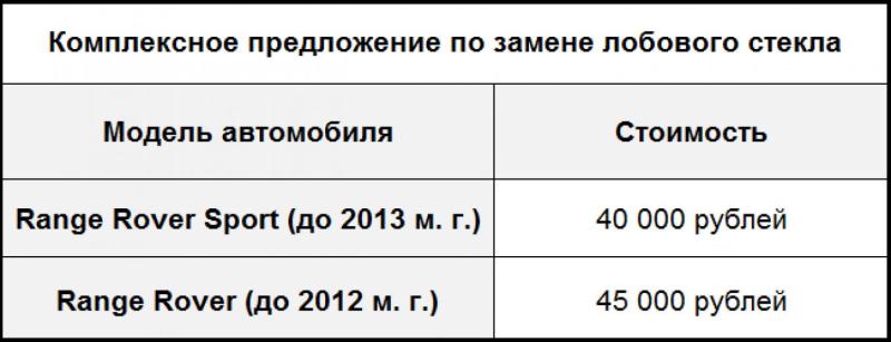 В стоимость включены все необходимые работы и расходные материалы, а также оригинальные лобовые стёкла Land Rover с подогревом и датчиком дождя.