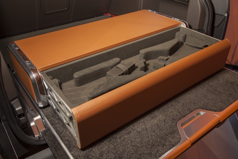 В качестве аристократичной изюминки выступает гравировка на металлических элементах внутренних ручек дверей, которая только подчеркивает сходство этой эксклюзивной версии внедорожника с дорогой винтовкой от Holland & Holland на четырех колесах. В багажнике установлен ящик для хранения охотничьего оружия. Специальная выдвижная площадка позволяет присесть, скажем, для смены обуви. Кроме того, эту секцию можно использовать в качестве столика.
