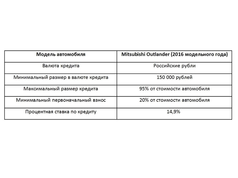 Условия программы кредитования новых автомобилей Mitsubishi Outlander 2016 модельного года действуют с 1 по 31 марта 2017 года. Основные условия предложения представлены в таблице ниже.
