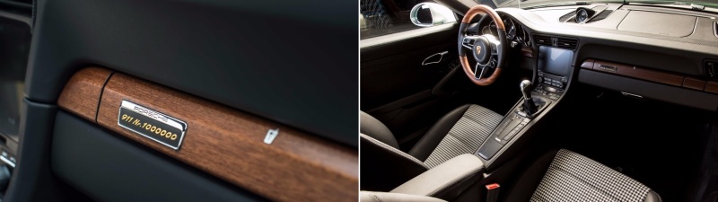 Миллионный Porsche 911 Carrera S создан в эксклюзивном цвете Irish Green с многочисленными деталями внутренней и внешней отделки по мотивам оригинального «девятьсот одиннадцатого» прошлых лет. Юбилейный Porsche 911 отметили особенной отделкой интерьера, отчасти повторяющей первую версию 1963 года – сиденья вручную обшиты кожей, а панель украшена деревянными вставками.