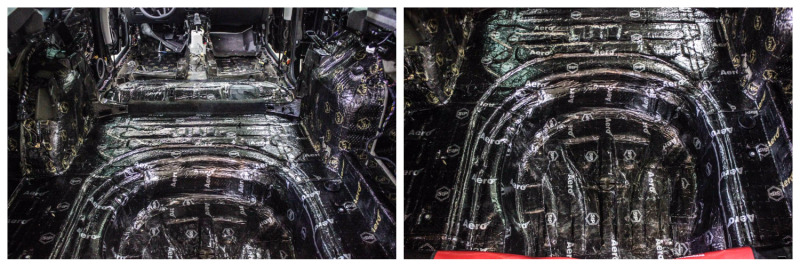 Металл под задним диваном, как область со средним уровнем вибрационной нагрузки, обрабатываем уже с использованием более легкого материала под названием Aero Plus. Это один из наиболее часто используемых нами продуктов StP, так как при небольшой толщине (3 мм) и умеренном весе (1 кв. м = 4,2 кг, т.е. вес одного листа менее 1,5 кг.!) данный вибродемпфер обеспечивает очень высокие показатели КМП (0,5 ед.) и отличается прекрасной работоспособностью при минусовых температурах.