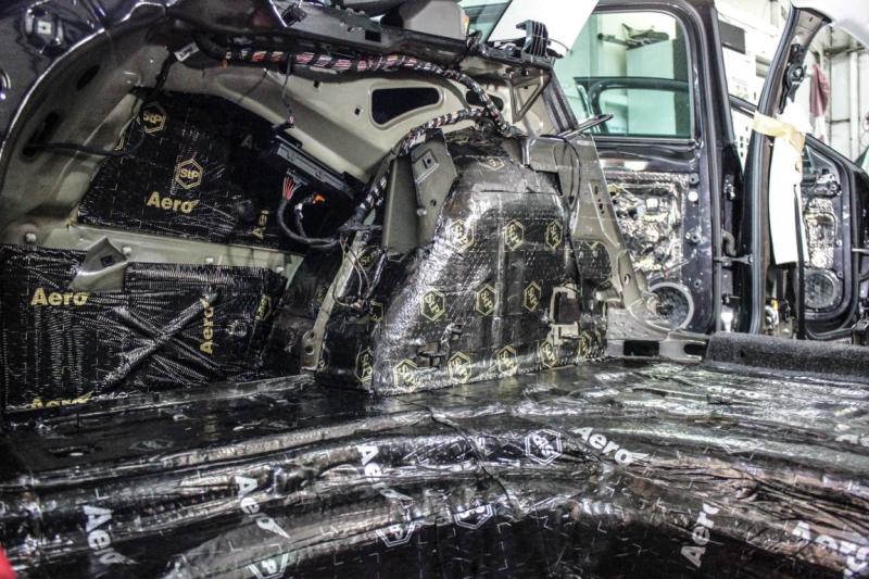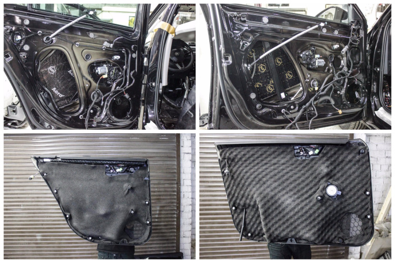 Как обычно, двери являются далеко не последними «связными» проезжающих мимо машин и аэродинамического шума. Обрабатываем конструкции в три слоя: сперва покрываем внутреннюю стенку облегченным вибродемпфером Aero Plus, затем – вспененным полимером Акцент Premium (10 мм), который призван впитывать воздушный шум. Роль отражающей мембраны выполняет 2-миллиметровый Aero, выполненный по Light-рецептуре, которая разработана специально для использования в авиации.