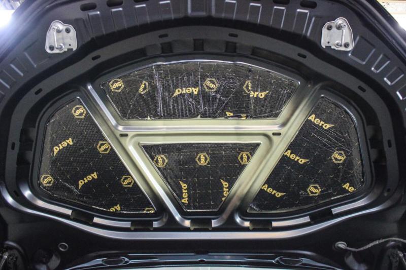 Капот под термощитом оказался неожиданно бедным на усилители жесткости. Положительным моментом стала возможность покрытия вибродемпфером Aero Plus довольно большой площади металла. Это сделало капот намного жестче, тише и снизило его теплопроводное свойство. По аналогии с дверными панелями обрабатываем и обшивку крышки багажника.