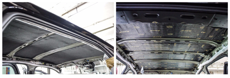 На потолке мы обнаружили куски виброизолирующего материала, но в таком количестве это, скорее, символизм, нежели реальная защита от механических колебаний и тем более звуков. Следуя регламенту пакета «Премиум», обрабатываем всю доступную площадь с использованием Aero Plus. Аэро Плюс ощутимо повышает жесткость листового металла крыши, что заметно даже без замеров при помощи сложного оборудования.